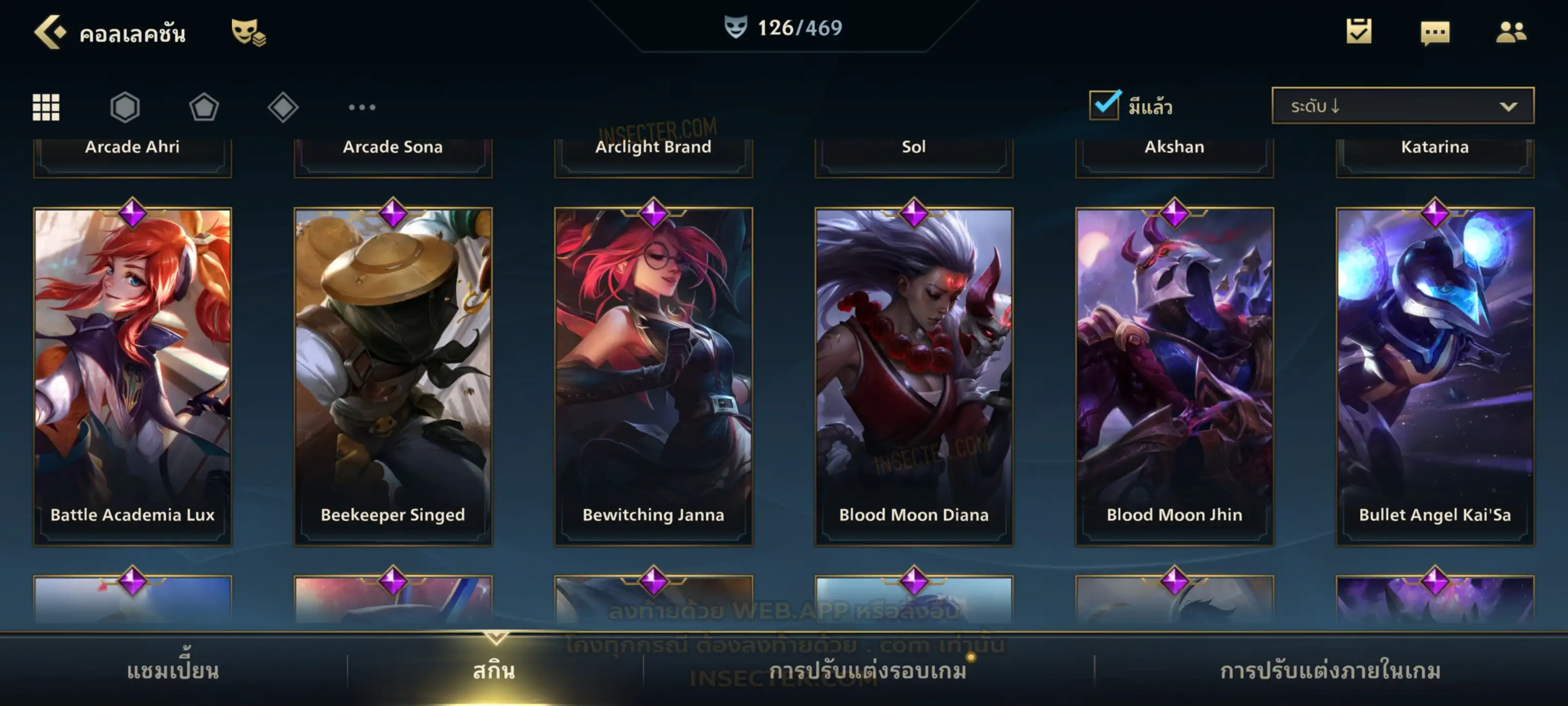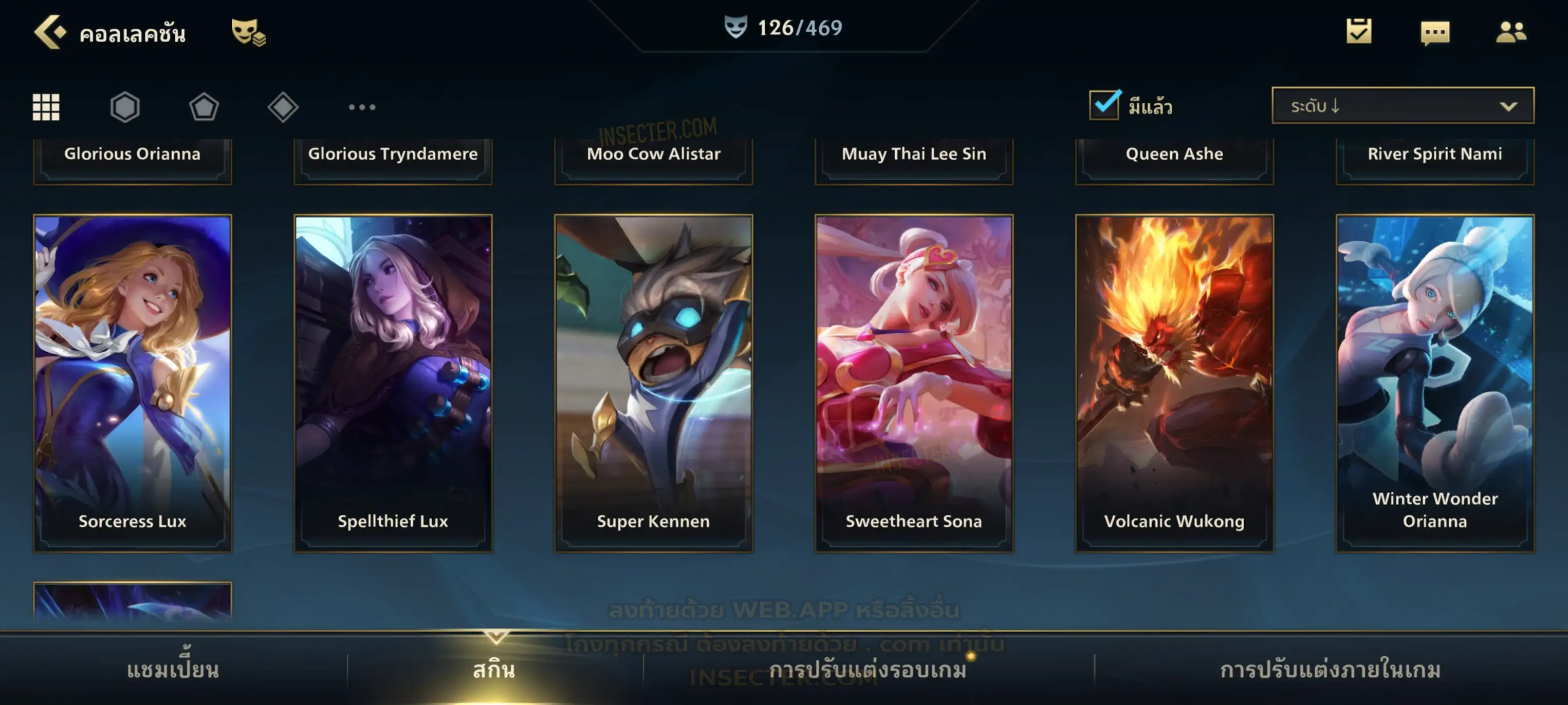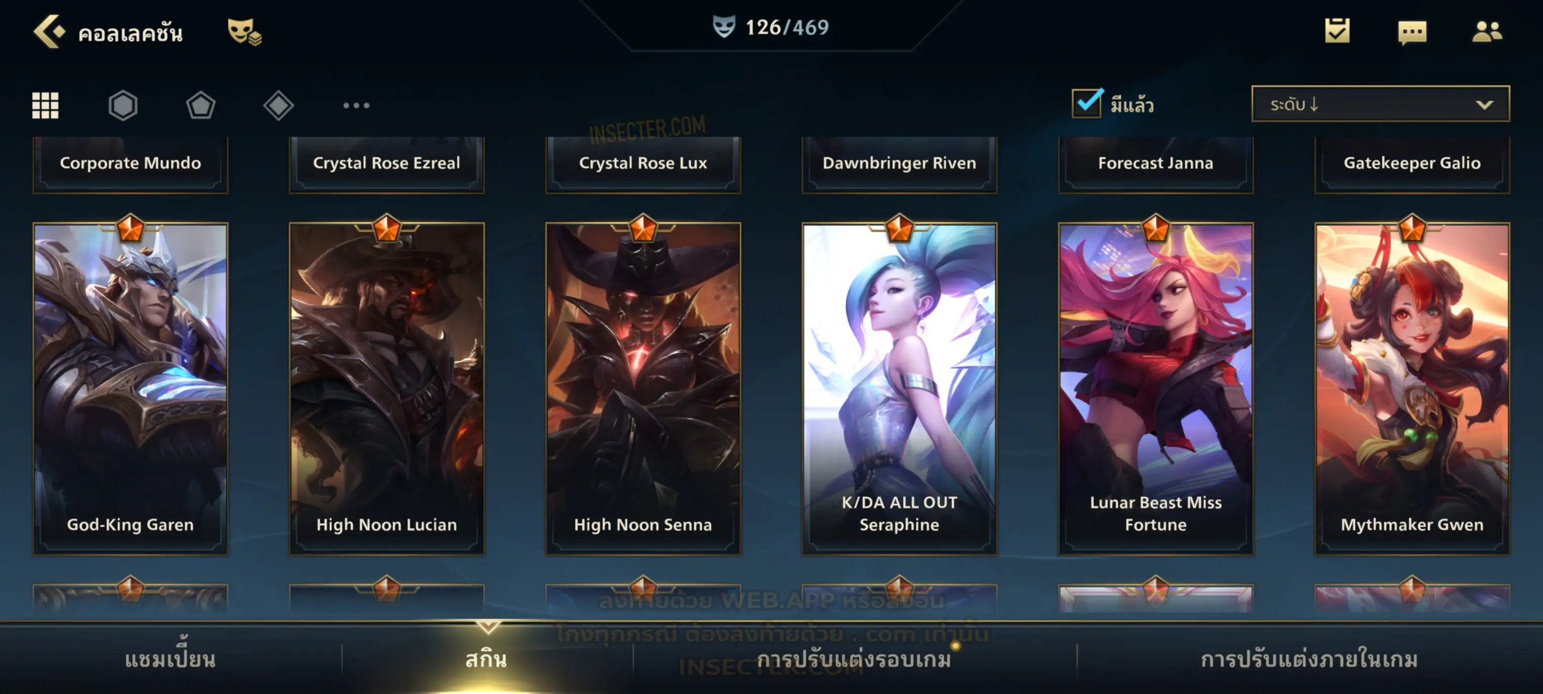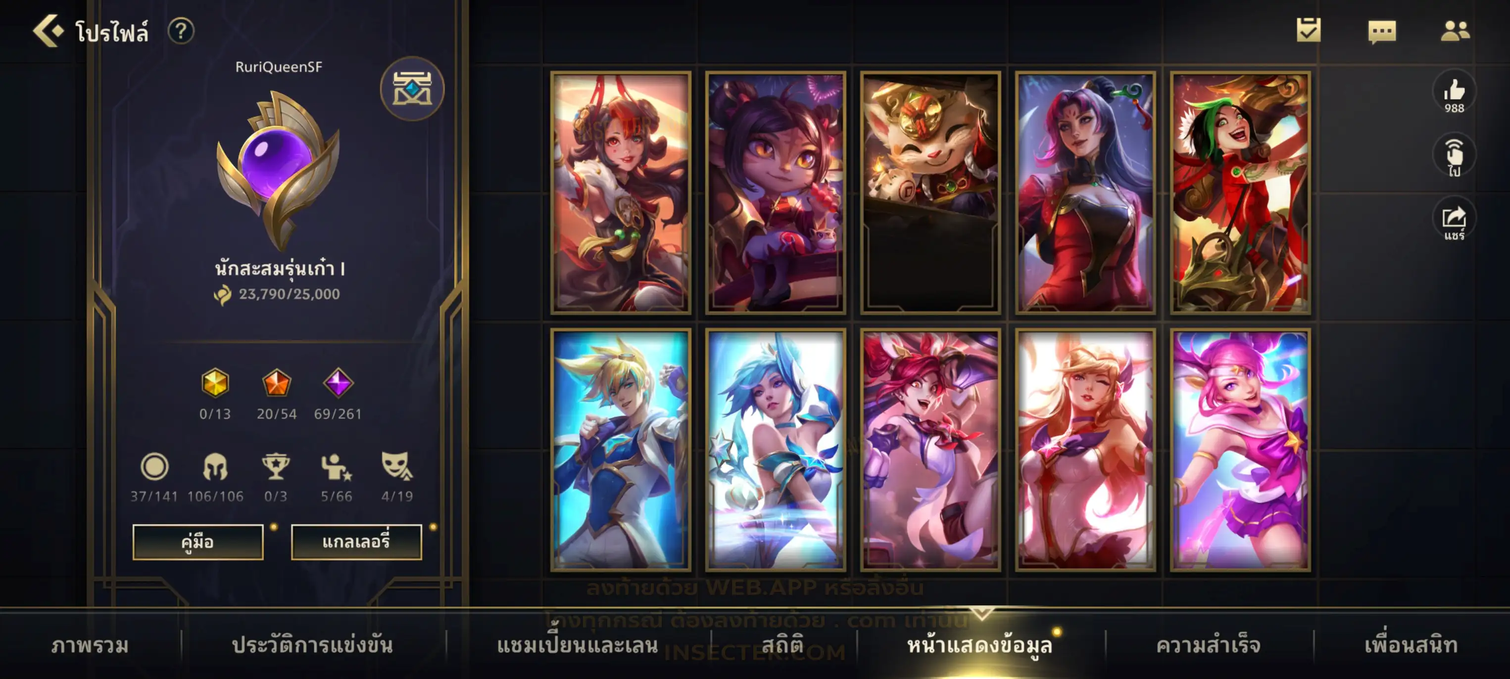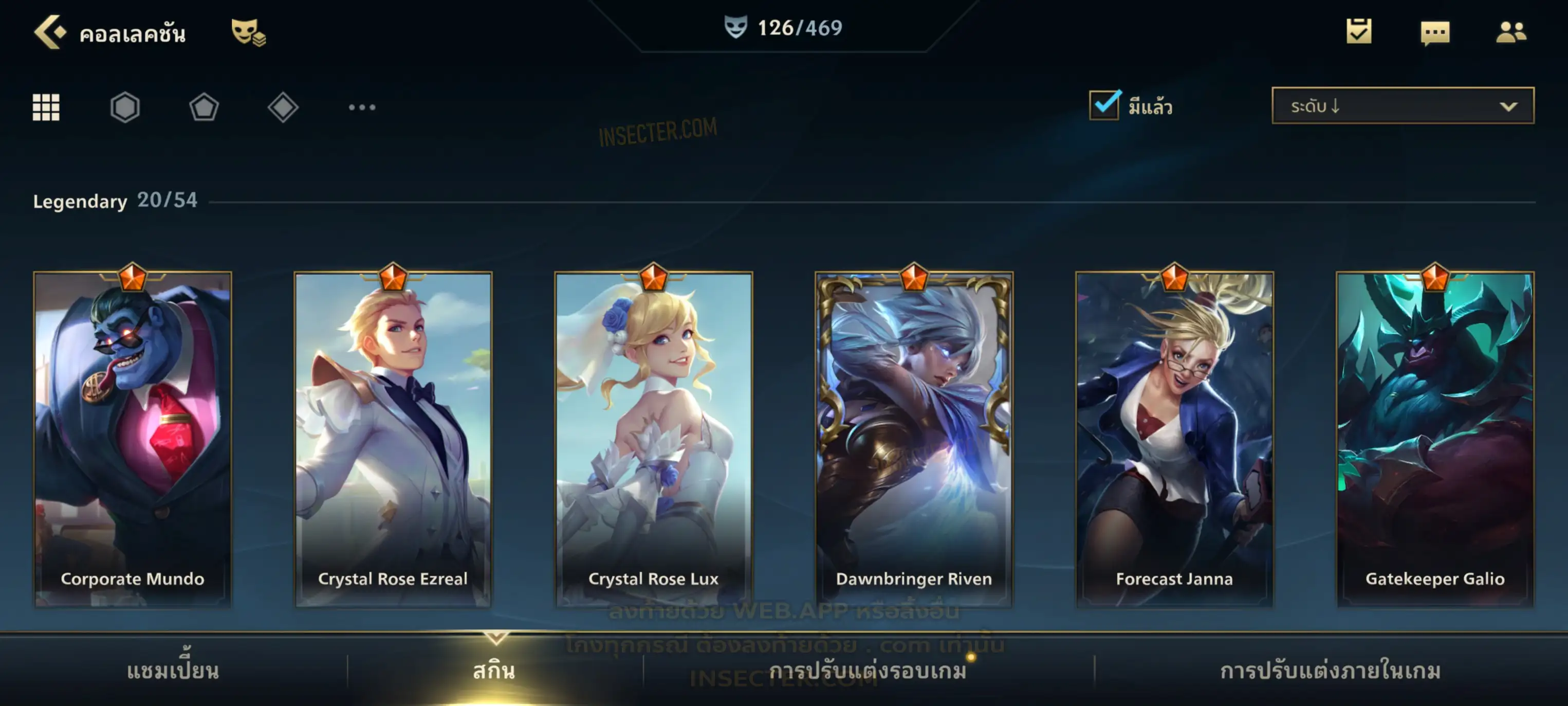 ข้อมูลย่อ : เมน MID-AD-TOP แชมครบของตกแต่งเยอะมีลิมิเต็ด 5 สกินคุ้ม ๆ จ้า ราคา 2,700 บาท 106/106 >แชมเปี้ยน 126 >สกิน 20 >Legendary (กรอบลิมิเต็ด 3 กรอบ) 69 >Epic (กรอบลิมิเต็ด 3 กรอบ+ท่าโพสพิเศษ 3 ท่า) 37 >อื่นๆ (กรอบลิมิเต็ด 6 กรอบ + ท่าโพสพิเศษ 2 ท่า)
