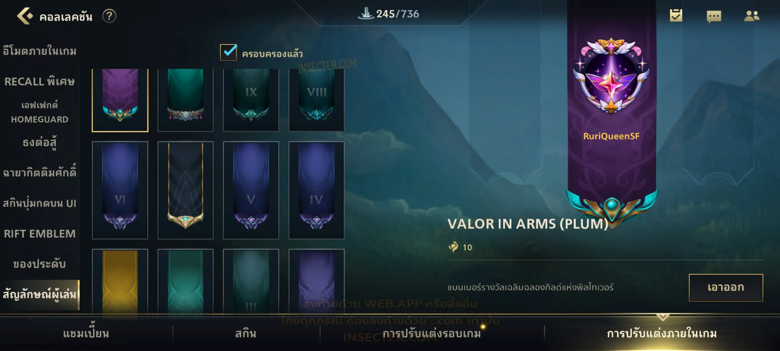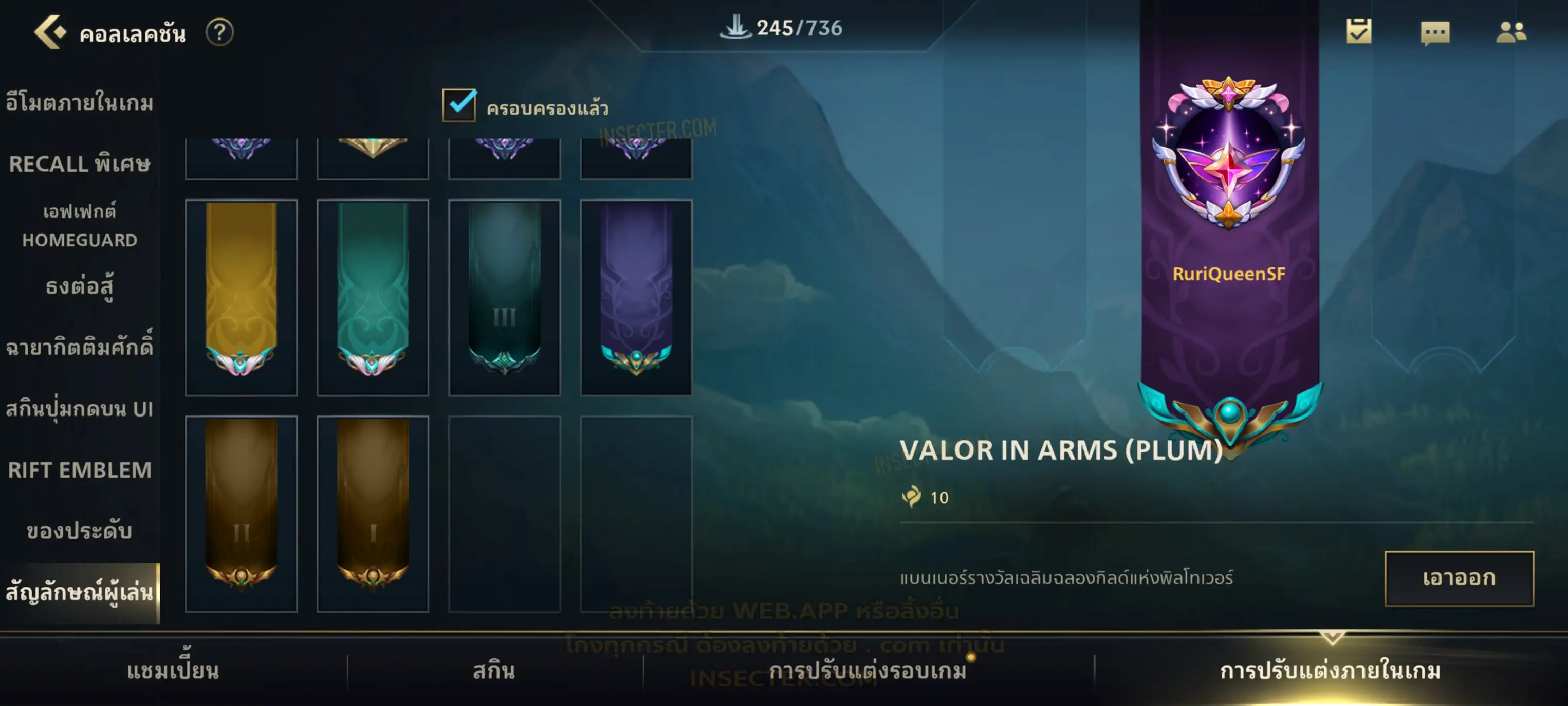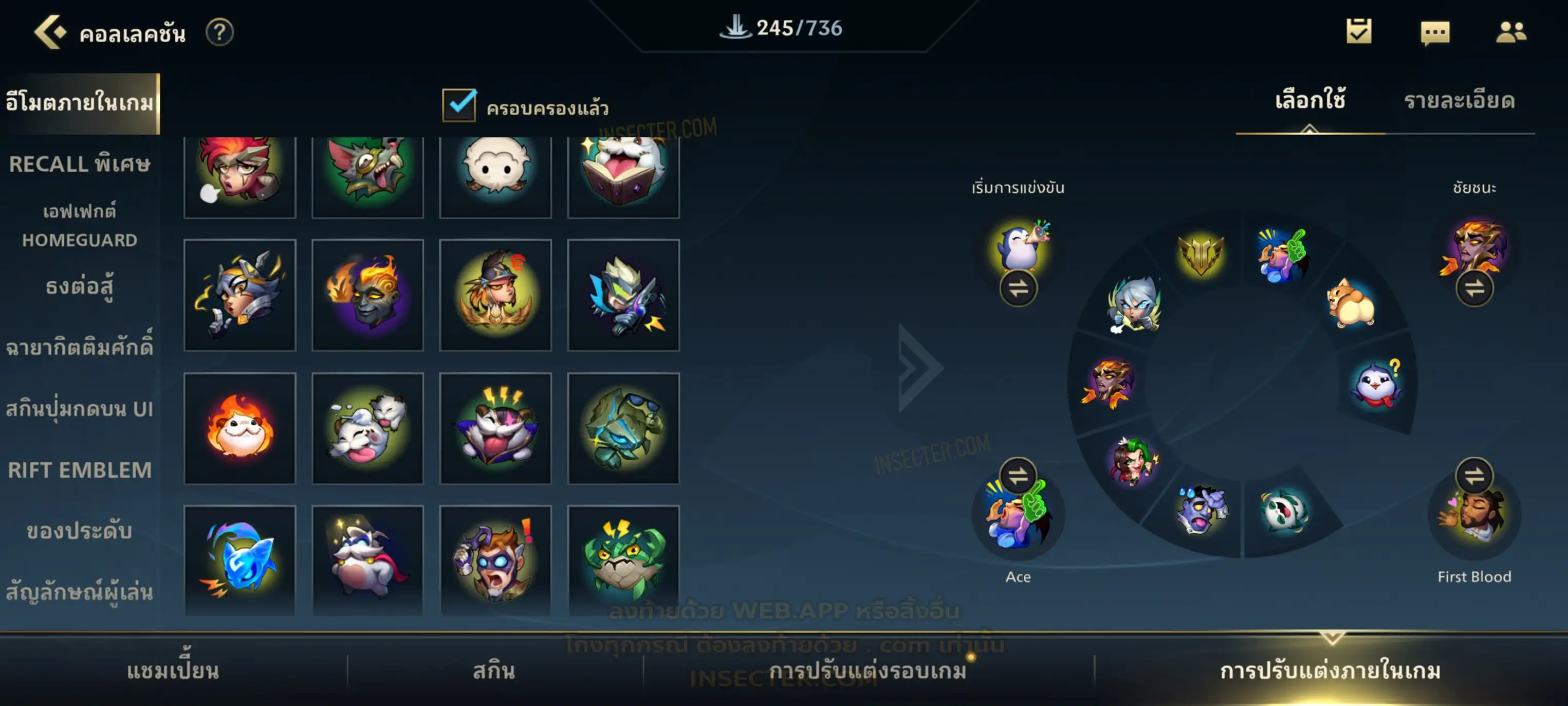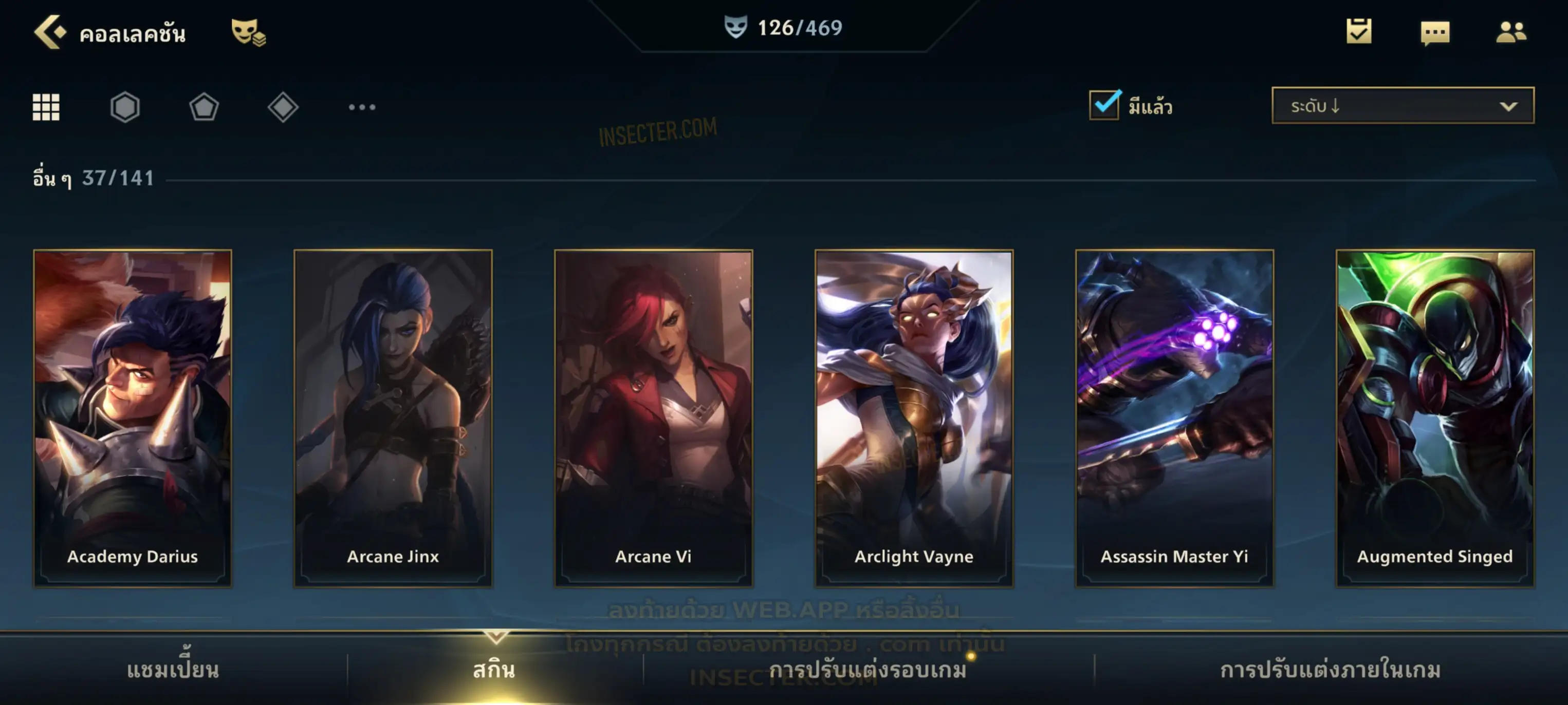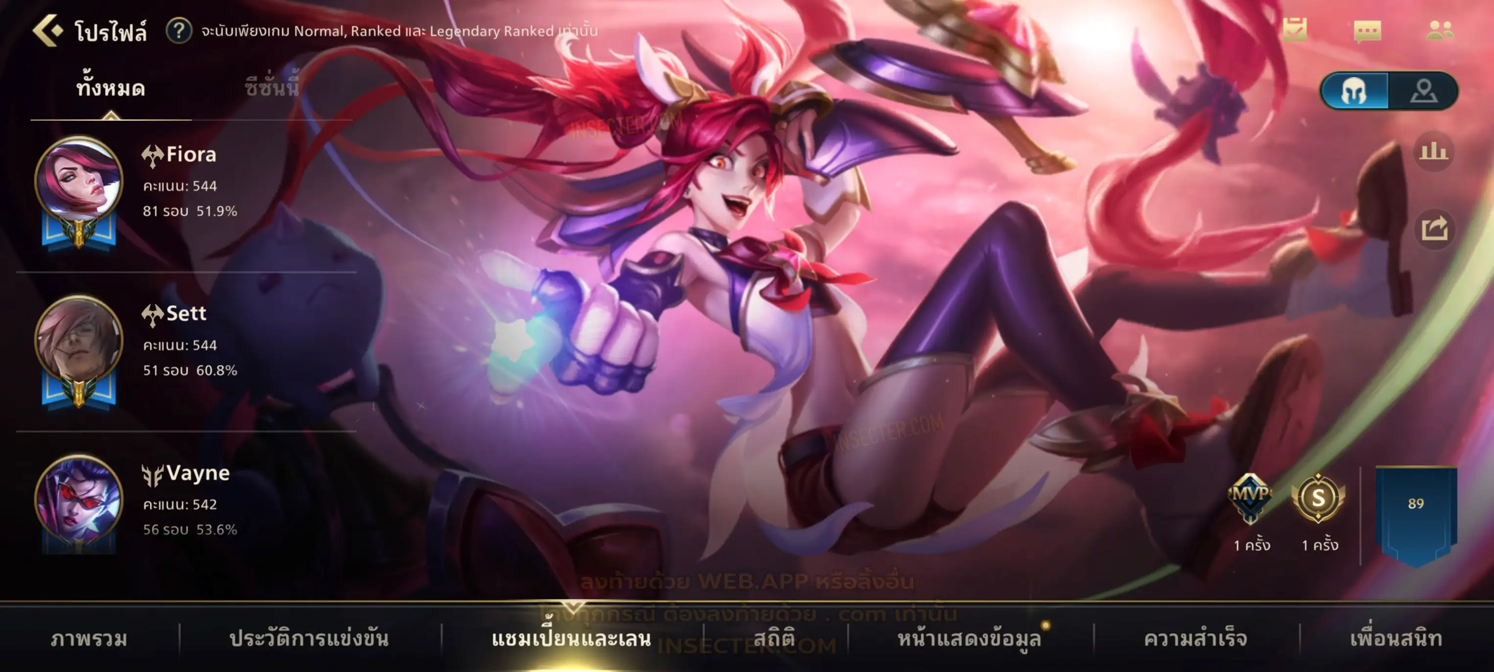 ข้อมูลย่อ : เมน MID-AD-TOP แชมครบของตกแต่งเยอะมีลิมิเต็ด 5 สกินคุ้ม ๆ จ้า ราคา 2,700 บาท 106/106 >แชมเปี้ยน 126 >สกิน 20 >Legendary (กรอบลิมิเต็ด 3 กรอบ) 69 >Epic (กรอบลิมิเต็ด 3 กรอบ+ท่าโพสพิเศษ 3 ท่า) 37 >อื่นๆ (กรอบลิมิเต็ด 6 กรอบ + ท่าโพสพิเศษ 2 ท่า)
