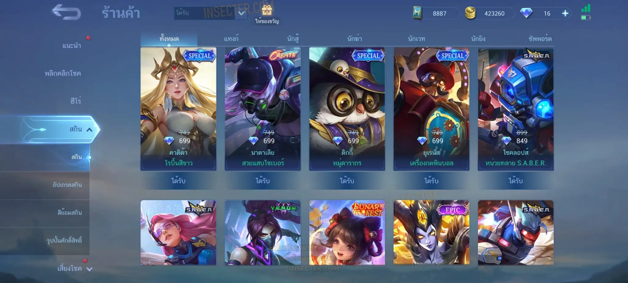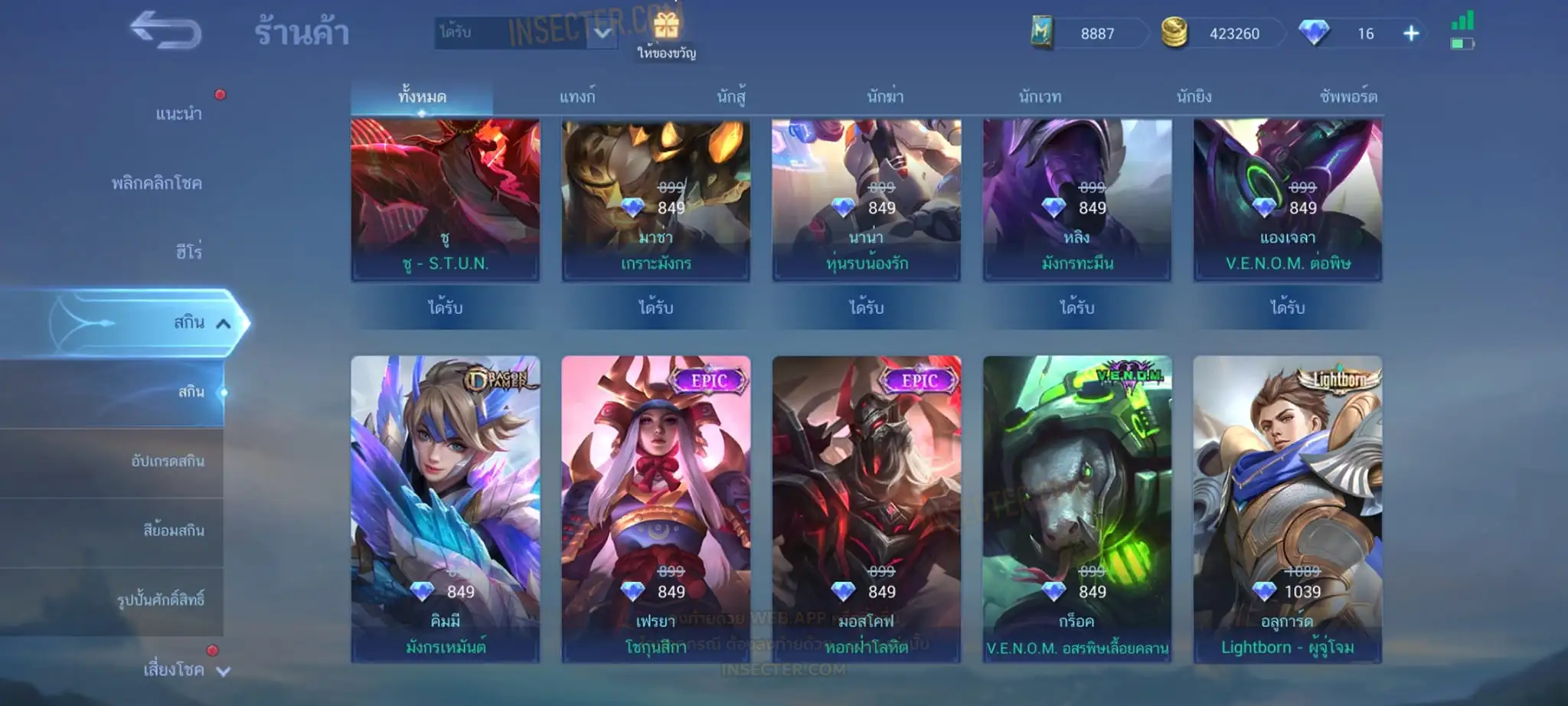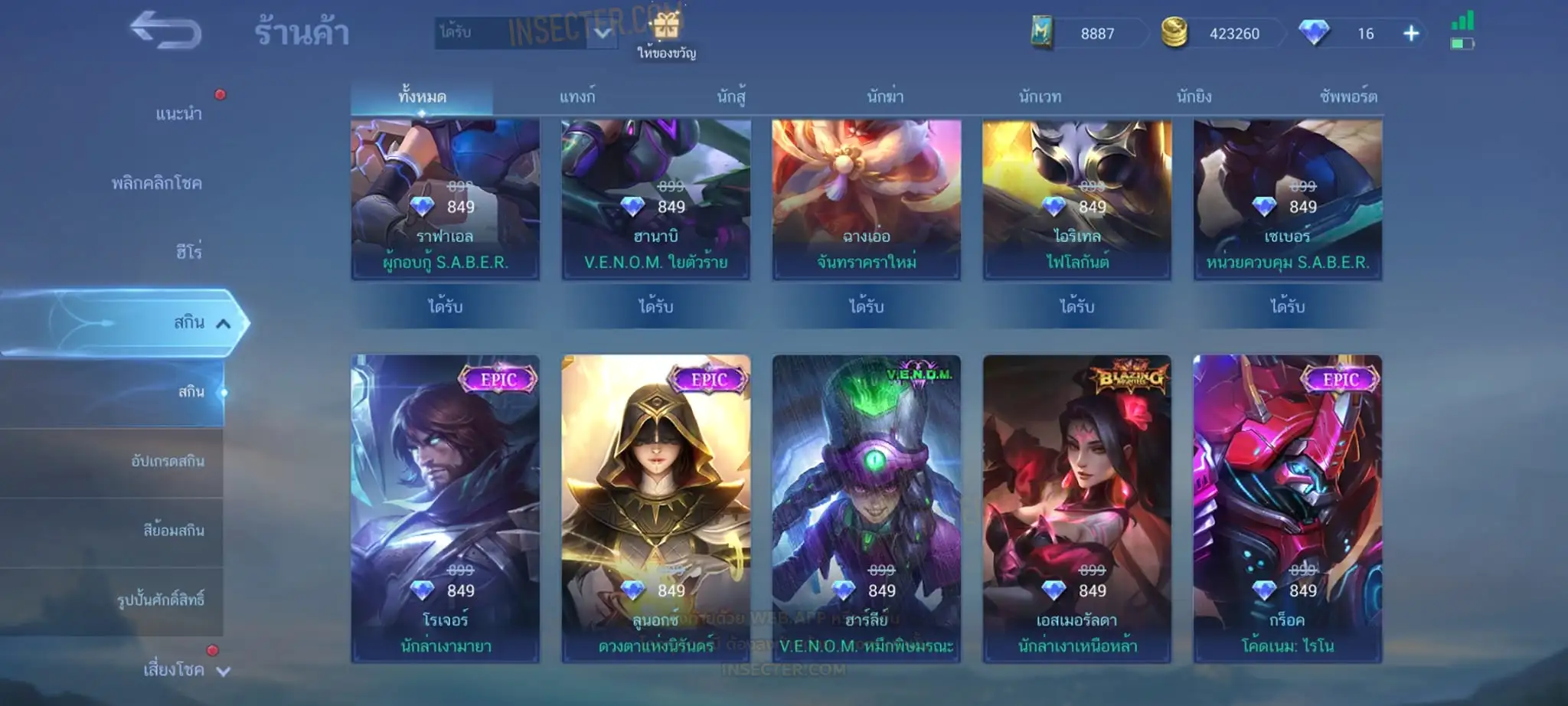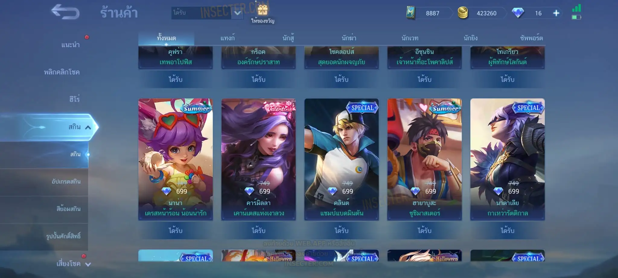 ข้อมูลย่อ : Hero 122 Skin 320 เอ็มเบลตัน/วาร์ปแรร์ร่มไฟ/หยินหยาง/ซุปเปอร์ฮีโร่ ถาวร !!! ผลึกแสงดาว 3,488 (ครบ 5,000 เลือกแลก Skin Ser 1 ตัว) 1.ฟรังโก้ Legend 2.มิยะ Legend 2.ชู Saint Seiya 3.บรูโน่ Dawning 4.รูบี้ อนิเมะ 5.เมลิสซา โนบาระ 6.อะไค กังฟูแพนด้า ครบเซ็ท !!! 7.หลิง อ๋องเช็น ครบเซ็ท !!! 8.ธามัส ไค ครบเซ็ท !!! 9.กูซิออน K 10.ชู อิโอริ 11.กวินนิเวียร์ อาธีน่า 12.คารีน่า ลีโอน่า 13.ชู S.T.U.N 14.ฟลอริน คิตตี้ 15.ฉางเอ๋อ Luner Fast 16.ฮาริธ Champion 17.เลสลีย์ Ster 18.คาร์รี Ster 19.บรูโน่ Neymar Jr 20.มา์ทิส Zodiac ถ่ายมาบางส่วนยังไม่รวม Skin Epic แรร์/Epic/Special/Elite/Season/Ster คอลเลคชั่นอื่นๆ #เติม Season Pass แล้ว