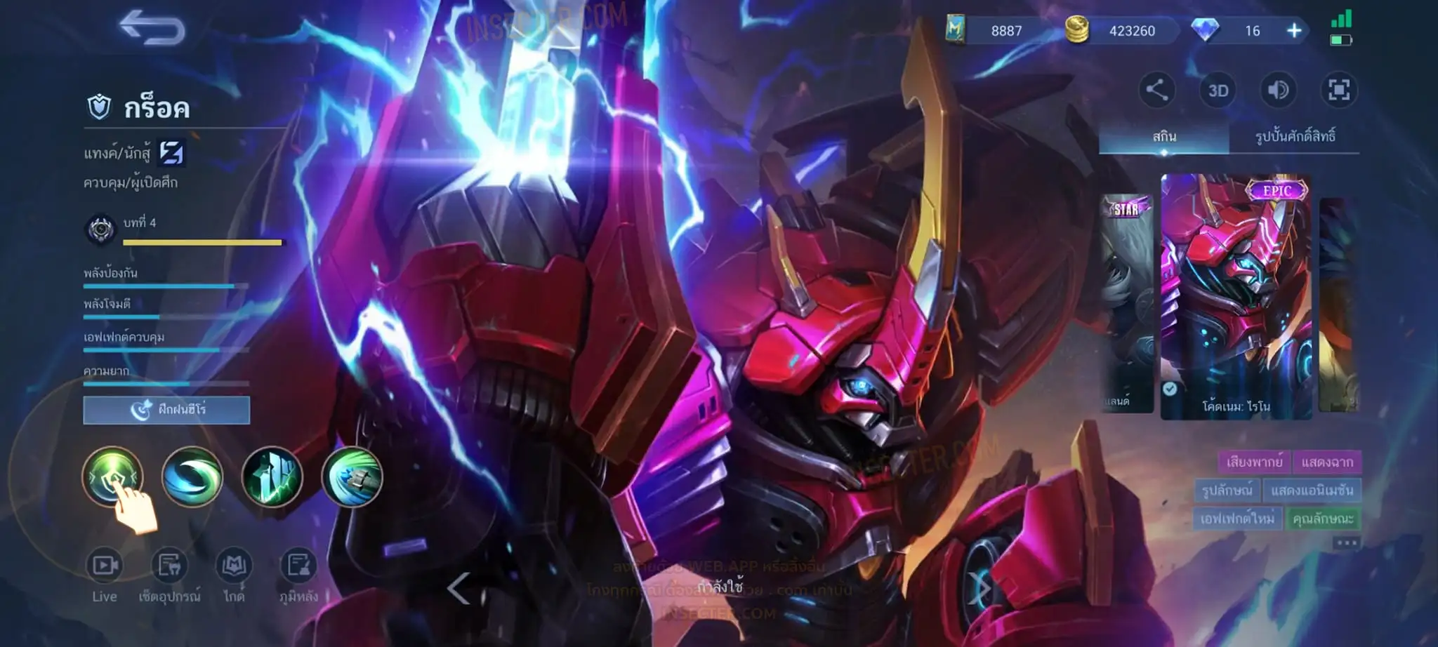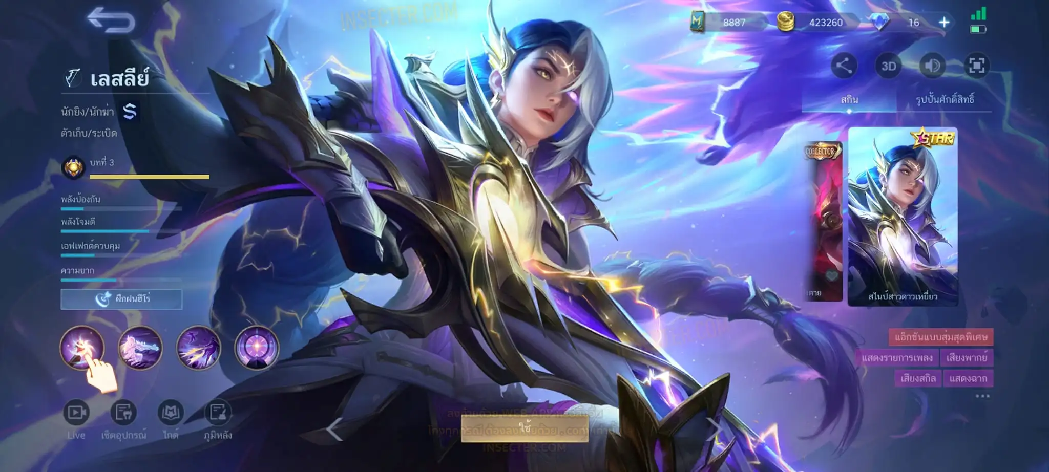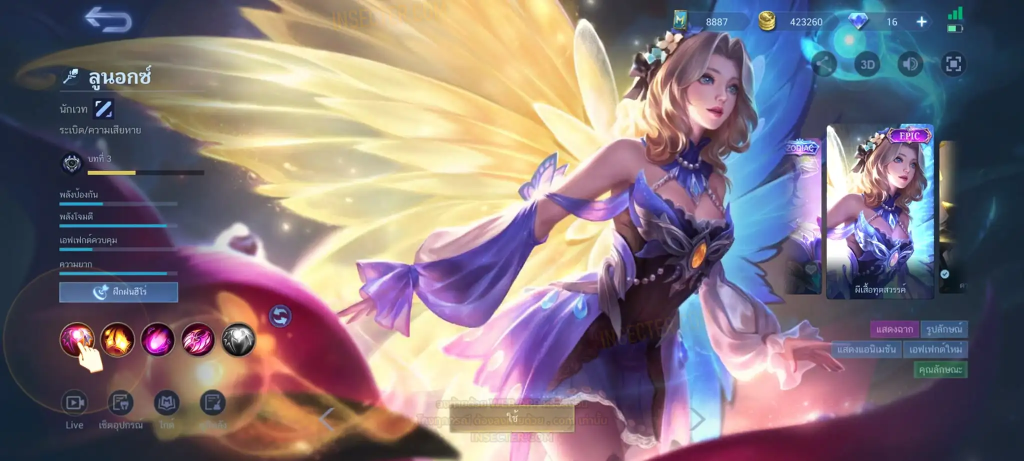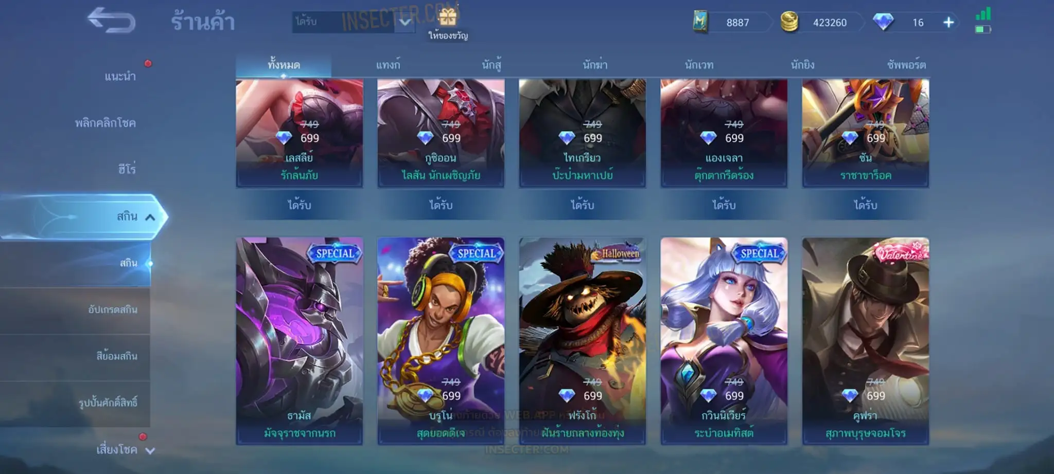ข้อมูลย่อ : Hero 122 Skin 320 เอ็มเบลตัน/วาร์ปแรร์ร่มไฟ/หยินหยาง/ซุปเปอร์ฮีโร่ ถาวร !!! ผลึกแสงดาว 3,488 (ครบ 5,000 เลือกแลก Skin Ser 1 ตัว) 1.ฟรังโก้ Legend 2.มิยะ Legend 2.ชู Saint Seiya 3.บรูโน่ Dawning 4.รูบี้ อนิเมะ 5.เมลิสซา โนบาระ 6.อะไค กังฟูแพนด้า ครบเซ็ท !!! 7.หลิง อ๋องเช็น ครบเซ็ท !!! 8.ธามัส ไค ครบเซ็ท !!! 9.กูซิออน K 10.ชู อิโอริ 11.กวินนิเวียร์ อาธีน่า 12.คารีน่า ลีโอน่า 13.ชู S.T.U.N 14.ฟลอริน คิตตี้ 15.ฉางเอ๋อ Luner Fast 16.ฮาริธ Champion 17.เลสลีย์ Ster 18.คาร์รี Ster 19.บรูโน่ Neymar Jr 20.มา์ทิส Zodiac ถ่ายมาบางส่วนยังไม่รวม Skin Epic แรร์/Epic/Special/Elite/Season/Ster คอลเลคชั่นอื่นๆ #เติม Season Pass แล้ว